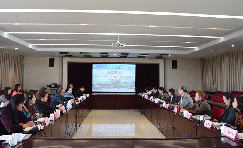 4月9日,昆明市人大常委会副主任常敏率队,一行12人到beat365官网开展涉外人才培养情况调研工作。学校校长丁文丽、副校长董建华,相关部门、学院参加调研。