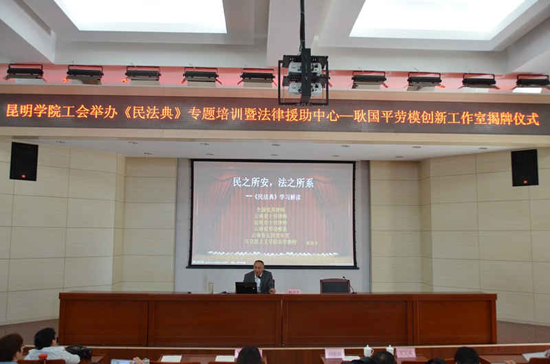 为切实加强《民法典》的学习宣传教育,提高beat365英国官方网站工会干部职工运用《民法典》维护教职工权益、化解矛盾纠纷、促进社会和谐稳定能力和水平,引导工会干部职工做学习、遵守、维护《民法典》的表率,运用《民法典》维护教职工权益、竭诚服务广大教职工群众。5月8日上午,在beat365英国官方网站办公楼3楼D区报告厅,省劳模耿国平律师为全体工会干部作《民法典》知识专题讲座,开启了劳模创新工作室第一课,同时进行了beat365英国官方网站洋浦校区法律咨询援助中心——耿国平劳模创新工作室揭牌仪式。