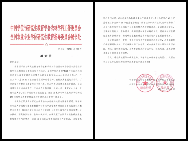 5月21-22日,全国农林院校研究生教育管理研修班暨农林研究生教育助力乡村振兴学术年会在学校成功召开。会务工作、会务专班以及志愿者服务工作得到了全国农林工作委员会、全国农业教指委秘书处、全体参会代表们的高度肯定和一致好评。5月25日,中国学位与研究生教育学会农林学科工作委员会、全国农业专业学位研究生教育指导委员会特发来感谢信,对所有参与会议筹备组织的领导、老师和志愿者表示感谢。