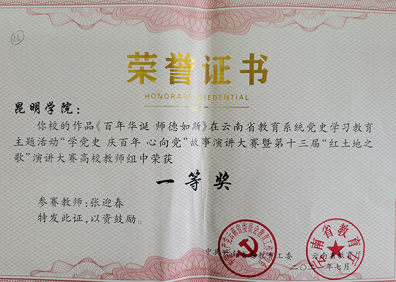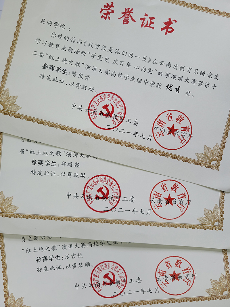 由中共云南省委教育工委、云南省教育厅主办的云南省教育系统党史学习教育主题活动“学党史 庆百年 心向党”故事演讲大赛暨第十三届“红土地之歌”演讲大赛在云南广播电视台微信公众号平台开展,大赛分为初赛、复赛、决赛三个阶段,学校荣获多个奖项。
