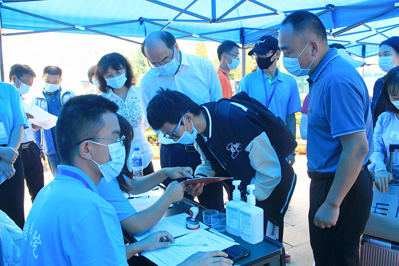 9月2日上午,学校党委书记金幼和、副书记李莉,副校长郭华、沈凡等校领导到新生接待站,了解新生注册报到情况,慰问现场工作人员和志愿者。金幼和书记强调,各部门、学院一定要认真做好新生入校报到、后勤保障和疫情防控工作,确保迎新工作安全顺利完成。金幼和书记还到学生宿舍看望新同学,亲切询问同学们报到时有没有遇到困难,来到新的环境适不适应,鼓励同学们在大学学习期间努力学好专业知识,培养新特长,展现新风采,实现人生新突破。