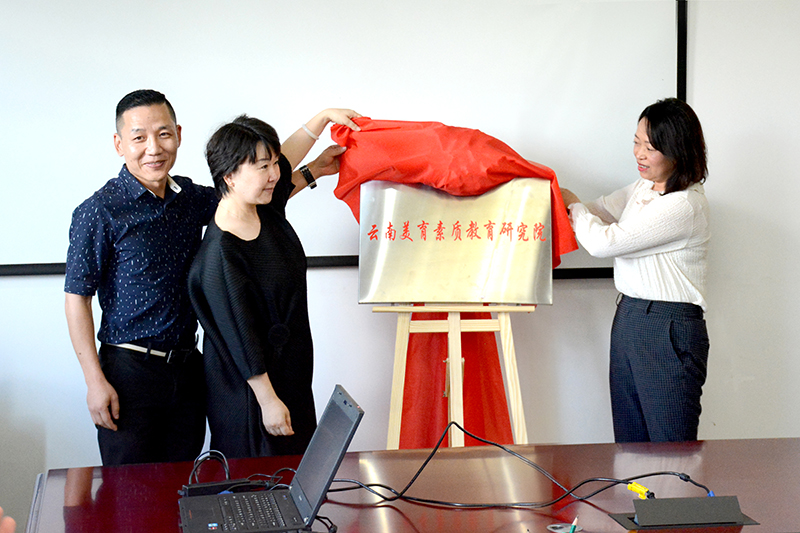 孔蓉副主任、丁文丽校长、冯昆董事长为“云南美育素质教育研究院”揭牌。