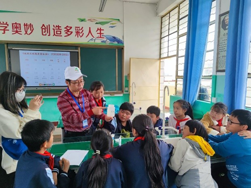 在中心赵峥副主任的带领下,一队教师和志愿者来到嵩阳街道山脚小学进行“普沙河水质检测科普活动”。高级工程师申亮博士深入浅出地对水资源保护的意义和地表水环境质量标准进行讲解;随后,中心教师分组带领山脚小学六年级的学生们使用简便试剂盒对提前采集的自来水、普沙河水样和校外沟渠水样进行总磷、氨氮、PH、化学需氧量、电导率、铜等水质指标的检测。在有趣的实验氛围中孩子们的科学思考能力及保护水资源意识得到培养与提升。