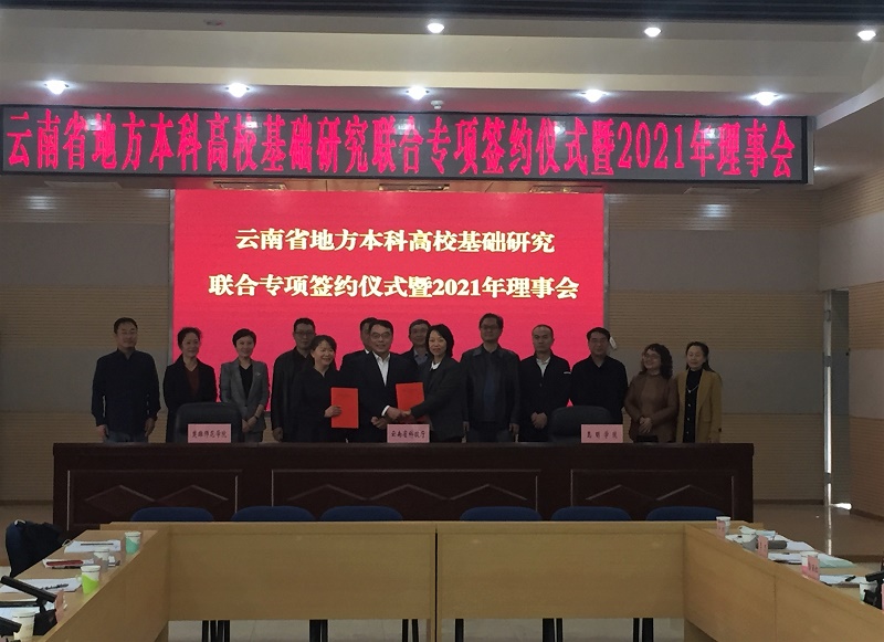 11月4日,云南省地方本科高校基础研究联合专项资金协议(第二期)签订仪式暨2021年理事会第一次会议在昆明举行。省科技厅厅长王学勤、二级巡视员王立新出席会议,beat365英国官方网站校长丁文丽、副校长马银海,楚雄师范学院校长王资等12家理事单位有关人员参加。会议由王立新主持。