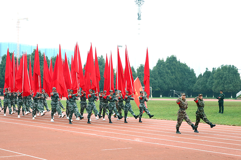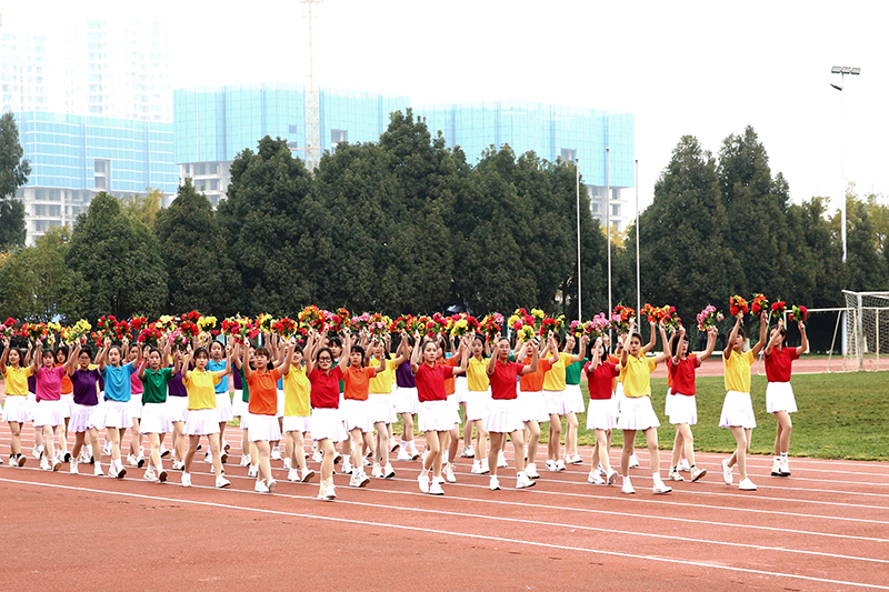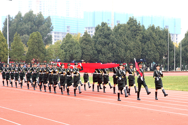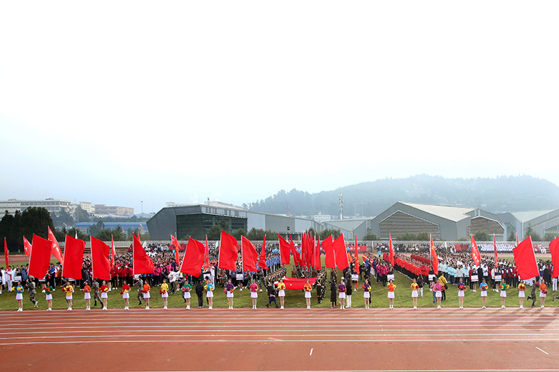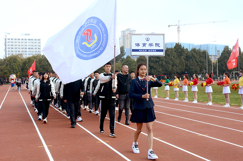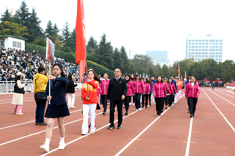 在激扬的乐声中,国旗班,校旗队、红旗队、鲜花队和裁判员、教职工代表、各二级学院、易班方队踏着整齐的步伐入场。