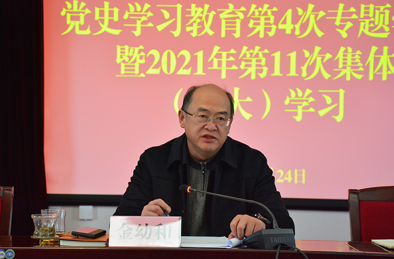11月24日,beat365英国官方网站党委理论学习中心组在办公楼502召开党史学习教育第4次专题学习暨2021年第11次集体(扩大)学习,专题学习研讨党的十九届六中全会精神。学校党委书记金幼和主持学习并讲话。