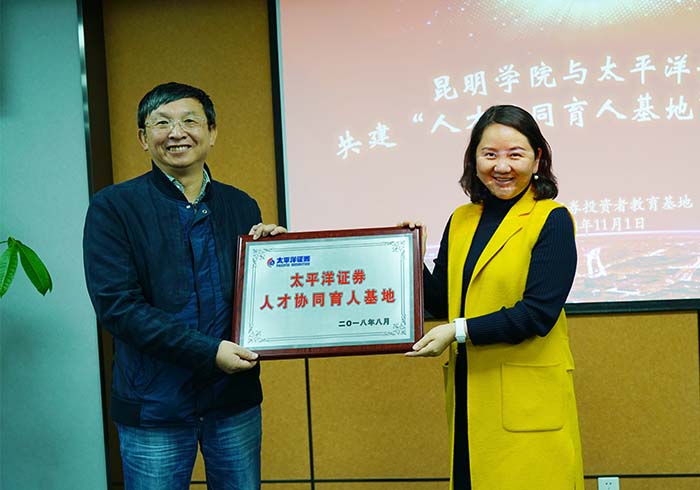 beat365英国官方网站副校长马银海、太平洋证券股份有限公司总裁助理兼云南业务中心总经理叶萍女士出席基地落成仪式并互授牌匾。马银海副校长为太平洋证券股份有限公司相关专家颁发聘书,聘请他们担任beat365英国官方网站金融类实践课的任课教师。