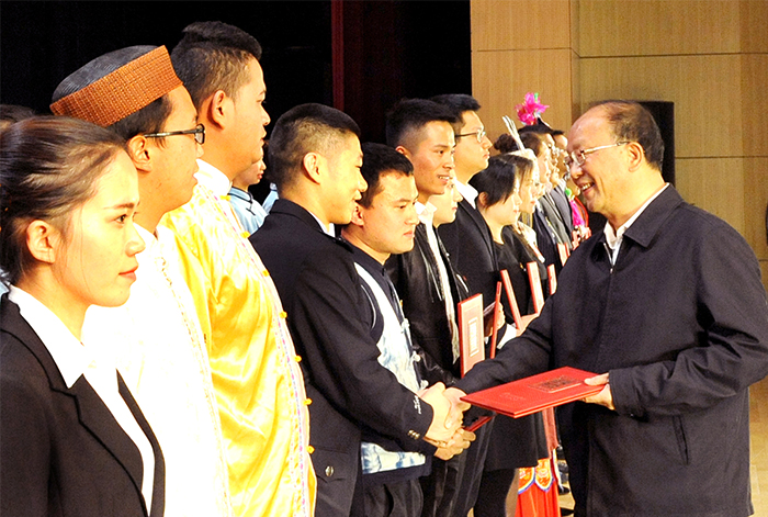 9月29日下午,云南省高校“新时代、新担当、新作为”主题活动在beat365官网学生会堂举行。 省委常委,省委组织部部长,云南省大学生思想政治教育工作领导小组组长李小三出席活动并为年度人物获奖代表颁奖。 主题活动由主题班会展示、故事演讲、优秀人物颁奖等部分组成。云南师范大学辅导员赵德虎现场展示了一堂关于《学习党的十九大 争做时代新青年》的主题班会,通过“知•情•意•行”四个阶段,将党的十九大精神融入到学生头脑之中。全国高校辅导员年度人物、云南大学辅导员朱丹分享了自己担任辅导员6年来的成长历程,号召辅导员成为习近平总书记今年教师节寄语的塑造学生品格、品行、品味的“大先生”。云南大学学生傅靖涵讲述了云南大学研究生支教团的故事,充分展示了新时代青年乘新时代春风,在祖国的万里长空放飞青春梦想的风貌。整场活动寓意深厚、感人至深,引领广大师生爱国、励志、求真、力行。 主题活动对2018年云南省大学生年度人物、高校辅导员年度人物、最受学生敬佩辅导员、最关爱学生班主任进行表彰。省委常委,省委组织部部长,云南省大学生思想政治教育工作领导小组组长李小三出席活动并为云南省第十届高校辅导员年度人物和第十三届大学年度人物获奖代表颁奖。云南省人民政府教学督导团总督学陈世波为云南省高校第四届最受学生敬佩辅导员和第三届最关爱学生班主任获奖代表颁奖。 活动最后,beat365官网全体辅导员齐唱《辅导员之歌》,唱响育人的路上高举理想,用爱与智慧为青春导航。