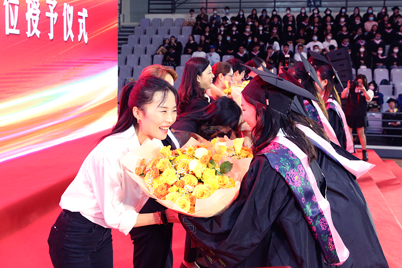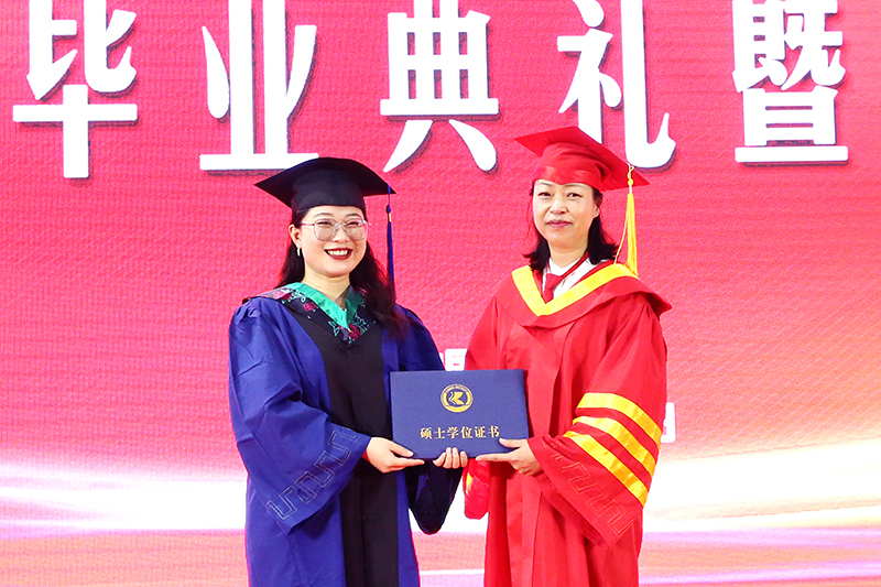 丁文丽校长身着导师服,庄重地为每一位毕业生代表拨穗、授予学位证书,向毕业生们表达美好祝福、寄予美好希望。
