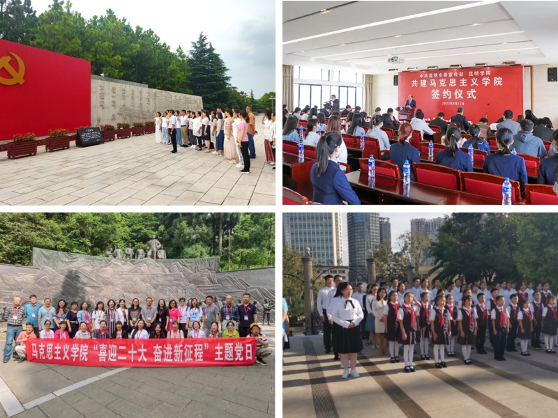 学院围绕学校改革发展大局和学院中心工作,充分发挥政治引领作用,把全面加强党的领导贯穿于立德树人全过程。一是深化理论学习,抓实理论研究阐释。充分利用党组织理论学习、周五学习、“学习强国”、“云岭先锋”、“周末大讲堂”各类学习平台,组织党员、干部开展学习教育,做到学习教育全覆盖,做到理论学习与教学工作相融合、相促进。发挥学科优势,深入研究阐释马克思主义中国化理论成果、习近平新时代中国特色社会主义思想,积极参与昆明市理论和政策咨询,努力发挥马克思主义学院在理论研究和解决现实问题中的智库作用,多篇决策咨询报告被地方政府采纳和转化为工作文件。二是加强党组织建设,抓强理论宣传教育。围绕“突出重点、凝练特色、创建品牌”的工作目标,严格落实支部规范化标准化建设,通过组织师生党员到扎西、嘉兴、遵义研学,不断增强党支部的凝聚力和战斗力。引导教师发挥专业优势,成立党的创新理论师生宣讲团,打造有影响力和感染力的理论宣传平台,深入机关、学校、企业、社区,广泛开展党的理论宣传和普及,不断推进新形势下马克思主义大众化。“习近平新时代中国特色社会主义思想学习园地”被省委宣传部、省委党史学习教育领导小组办公室评为“云岭百姓宣讲”示范点,多名教师被聘为省委教育工委、昆明市委和学校党委党史学习教育宣讲团成员。三是强化多元协同,抓实思政课一体化。在学校“ 四联动”工作“大格局”(思政课各课程间联动、传统教学与新媒体联动、思政课程与专业课程联动、马克思主义学院与职能部门联动)的指导下,实现课程思政与思政课程同向同行、日常思政工作与思政课程同频共振。学校与昆明市委宣传部共建马克思主义学院,建设”昆明市大中小学思政课一体化协同创新基地”;2022年9月,与长春小学、昆明市第二中学共同组织开展“讲好聂耳和国歌的故事、铸牢中华民族共同体意识”昆明市大中小学开学第一课活动。