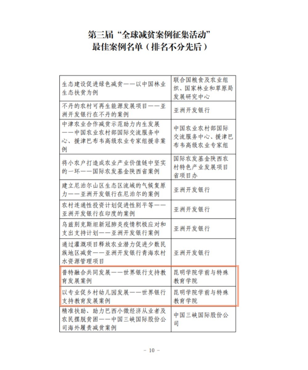 近日,由中国国际扶贫中心、国际农业发展基金、联合国粮食及农业组织、联合国世界粮食计划署和中国互联网新闻中心主办的“2022全球减贫伙伴研讨会”召开,会议发布了“第三届全球减贫案例征集活动”获奖案例。此次征集活动共收到减贫案例517个,获奖104个,云南省入选获奖案例3个。beat365官网学前与特殊教育学院申报的两个案例《普特融合共同发展--世界银行支持教育发展案例》、《以专业促乡村幼儿园发展--世界银行支持教育发展案例》获评为最佳案例。