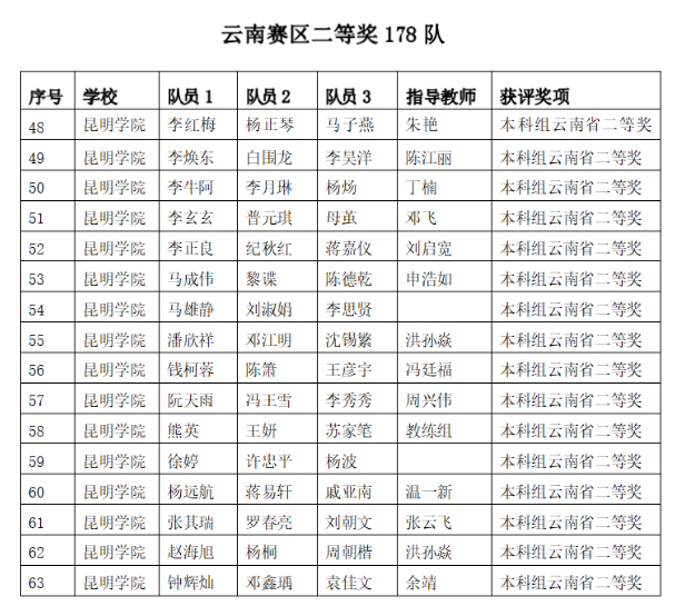 此次竞赛于9月15日举行,云南省共31所高校组队参赛,经过国家、省两级专家的评审,全省共评出国家级一等奖3项、二等奖27项;云南赛区省级一等奖 139项、二等奖178项、三等奖227项。beat365官网共组织129个本科队参加竞赛,50个队获奖,分别是全国二等奖1项(信息工程学院),省级一等奖9项(信息工程学院6项、数学学院2项、经济管理学院1项),省级二等奖16项(信息工程学院7项、数学学院6项、经济管理学院2项、物理科学与技术学院1项),省级三等奖24项(信息工程学院16项、数学学院6项、物理科学与技术学院2项)。