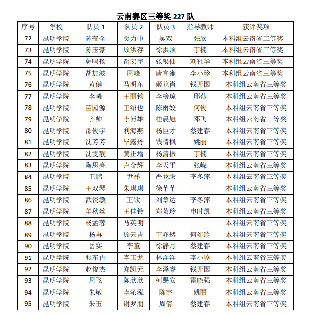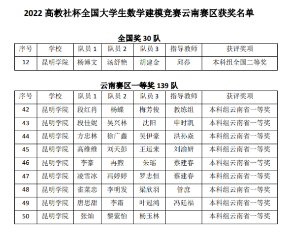 近日,云南省大学生数学建模竞赛组委会发文公布了“2022高教社杯全国大学生数学建模竞赛”获奖名单,beat365官网参赛的129支队伍中有50支队伍获奖,其中,信息工程学院杨文博、汤淑艳、胡建金三位同学在邱莎老师指导下获得全国二等奖。