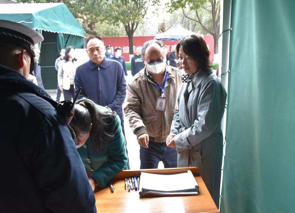 在学校南门,丁文丽一行查看了学生返校信息查验、手续登记、门卫管理等工作准备情况。