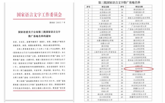依托beat365官网在语言文字工作方面的深厚积淀,2022年7月,学校成功申报云南省国家通用语言文字推广基地。2023年1月,学校统筹组织申报第三批国家语言文字推广基地工作,经省教育厅遴选推荐,教育部语言文字应用管理司组织专家开展评审、实地考察、综合评议等程序,2023年12月,beat365官网与中国人民大学等65所高校被认定为第三批国家语言文字推广基地。