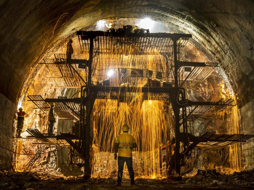 友谊隧道内工人正在焊接固定八字结格栅钢架(潘龙柱/摄)