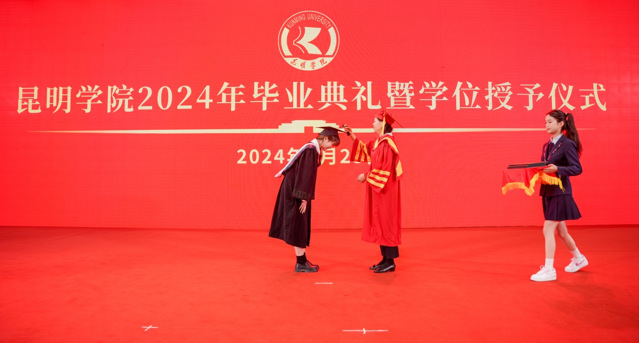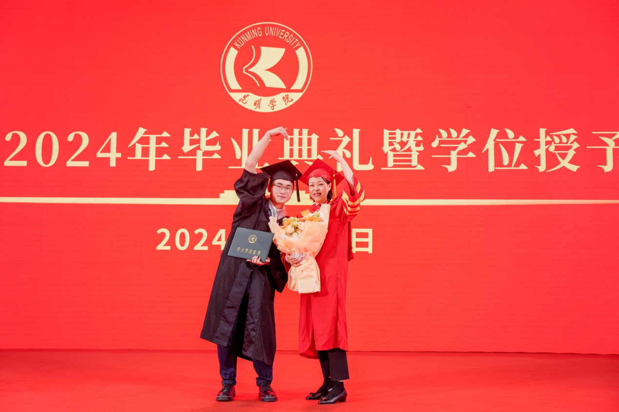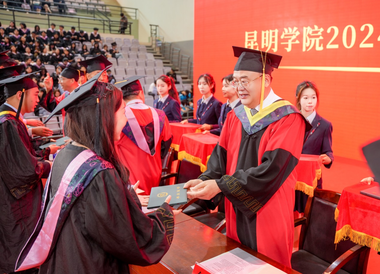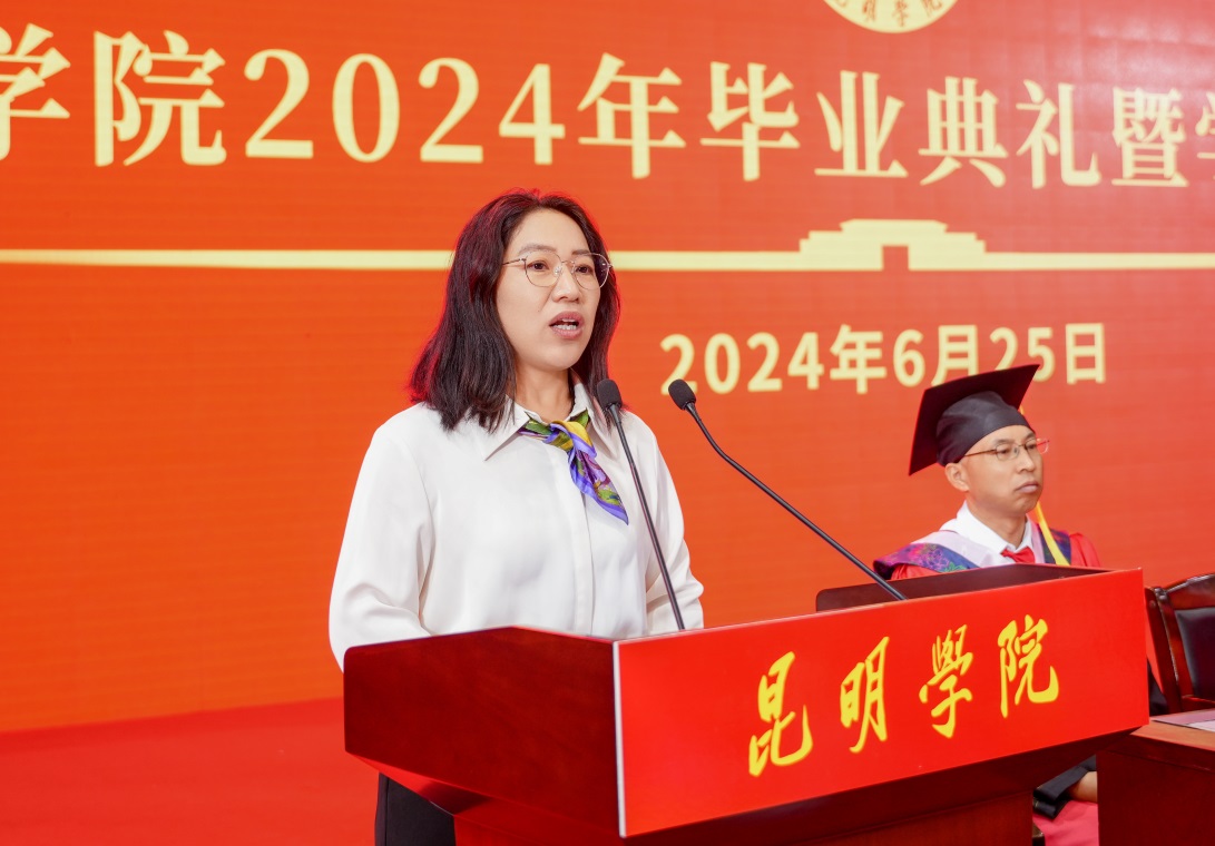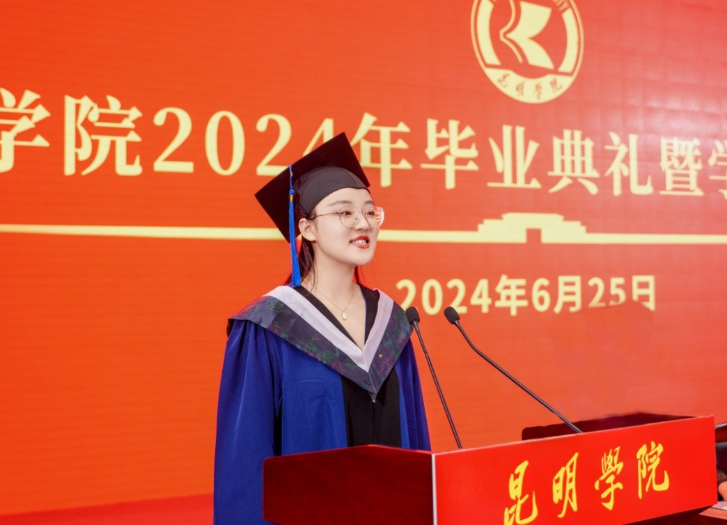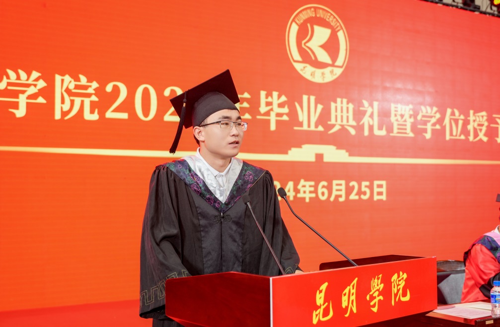 金幼和书记致辞,代表学校向2024届全体毕业生表示热烈祝贺,向一直以来辛勤耕耘、为同学们的成长成才付出心血汗水的老师们表示衷心的感谢。金幼和表示,四年前,同学们怀着梦想和激情从祖国四面八方来到beat365英国官方网站,与祖国同频共振奔跑逐梦,共同见证了中国共产党百年华诞的光荣时刻,见证了第一个百年目标顺利实现,见证了党的二十大吹响奋进新征程的时代号角。一同亲历了脱贫攻坚千年梦圆、全面建成小康社会、全面开启中国式现代化新征程的重要历史时刻。大学四年,同学们与学校同心同行,我们共同迎接学校第二次党代会胜利召开,共绘学校“十四五”高质量发展的锦绣蓝图,共担“更名大学”的历史使命,共谱“教育高质量发展三年行动”新篇,共创第九届“互联网+”大学生创新创业大赛的优异成绩,同学们以青春之光为昆院添彩,昆院以高质量发展为同学们赋能,师生共赴“建设特色鲜明的综合性应用型高水平大学”新征程,收获了成长、责任和担当,也证明了自己有潜力担当大任、掌握未来。