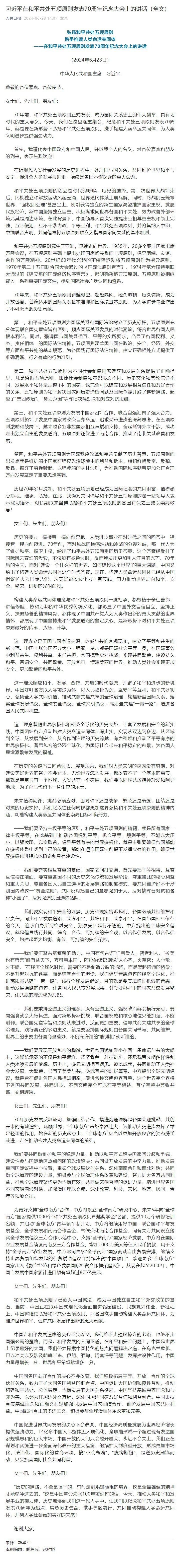 习近平在和平共处五项原则发表70周年纪念大会上的讲话(全文)
