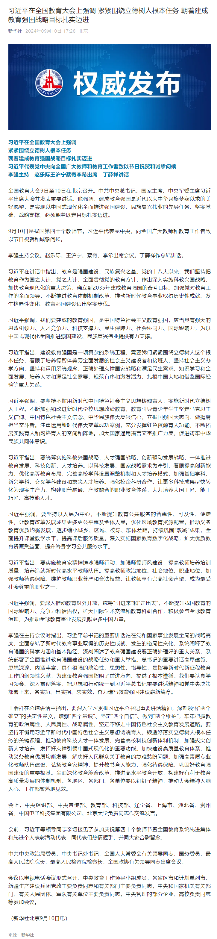 习近平在全国教育大会上强调 紧紧围绕立德树人根本任务 朝着建成教育强国战略目标扎实迈进