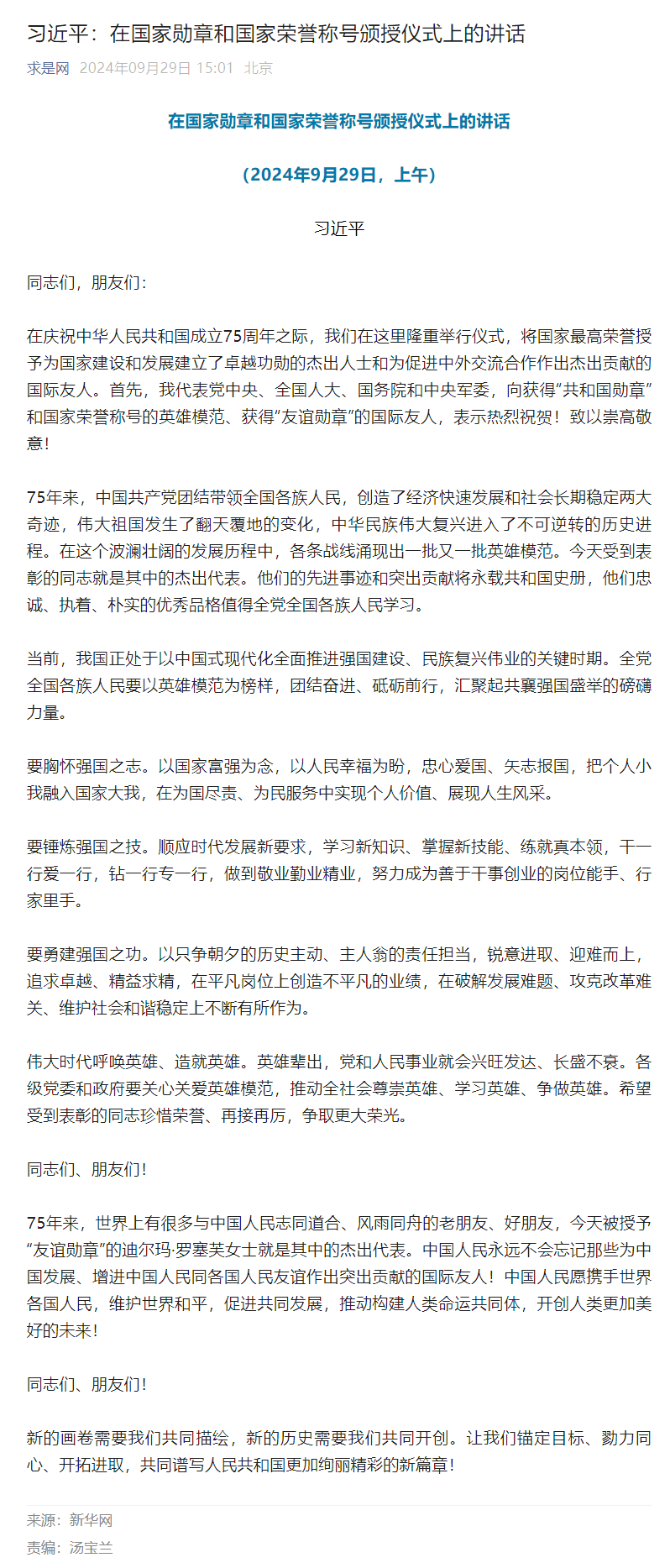 习近平:在国家勋章和国家荣誉称号颁授仪式上的讲话