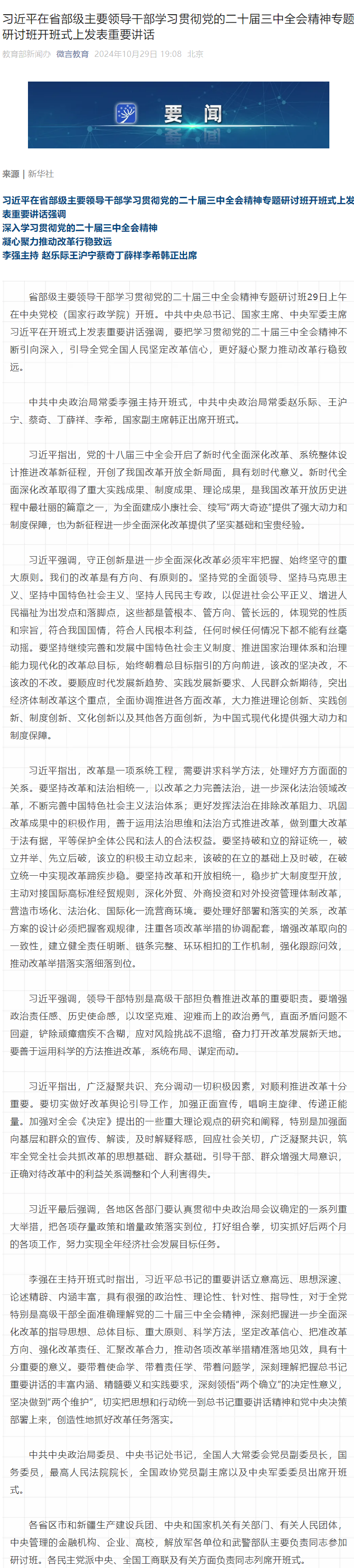 习近平在省部级主要领导干部学习贯彻党的二十届三中全会精神专题研讨班开班式上发表重要讲话