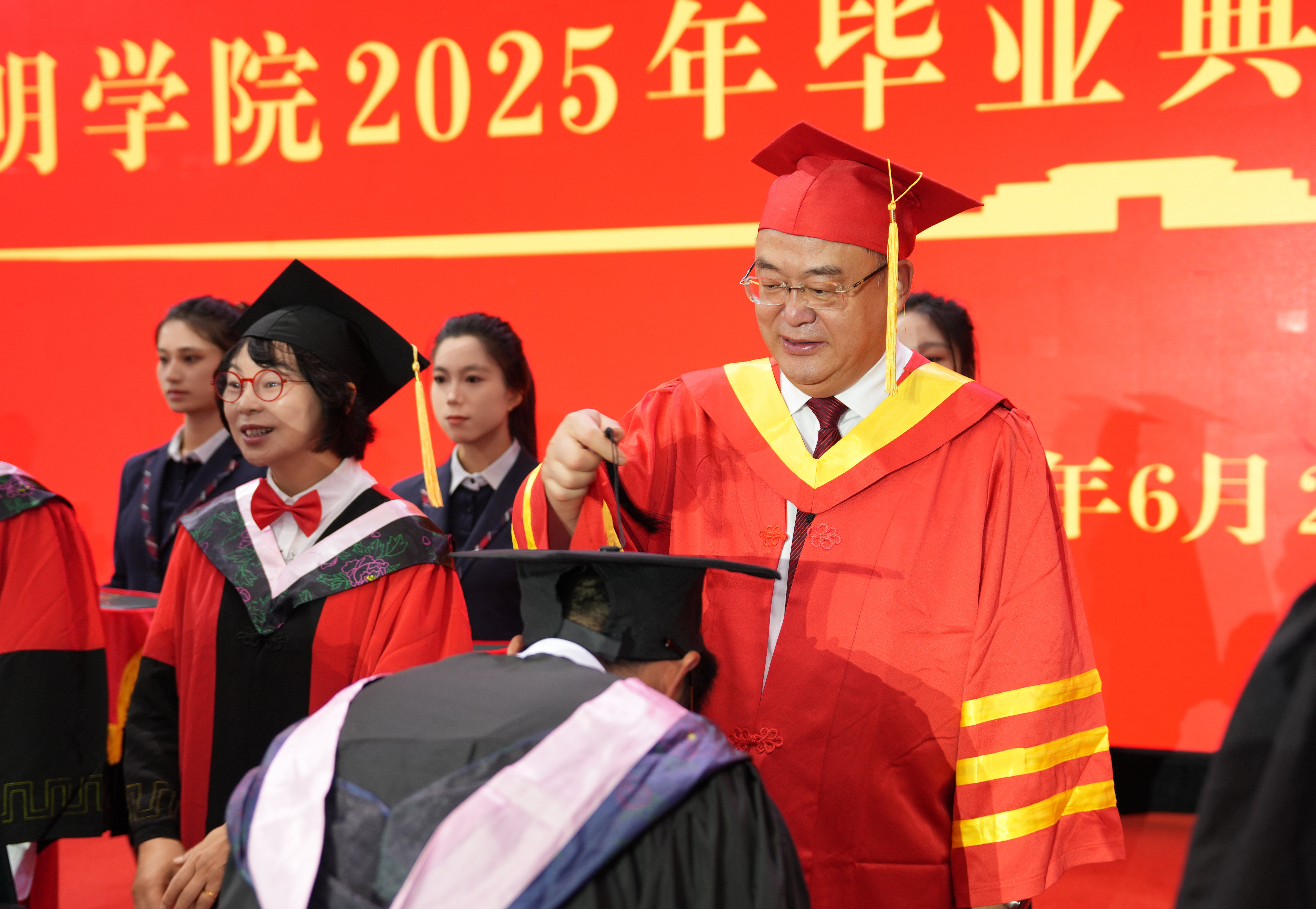 王凡宣读2025届beat365英国官方网站全日制硕士毕业生、本科毕业生毕业资格和学位授予决定。全体校领导为硕士毕业生、本科毕业生代表颁发毕业证书、行拨穗礼并授予学位证书。
