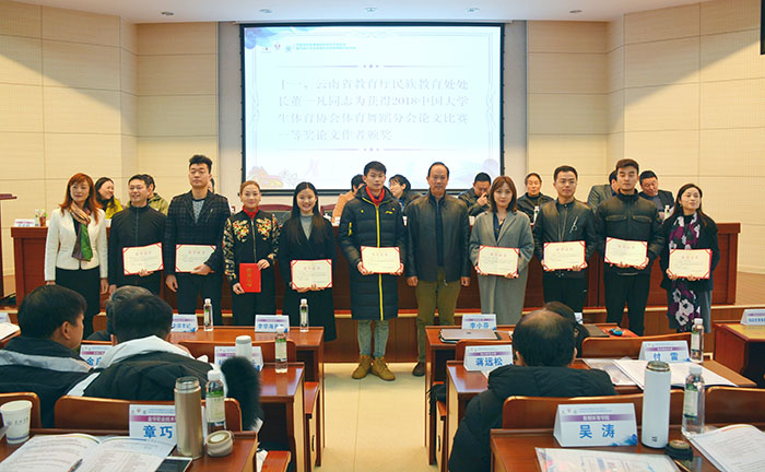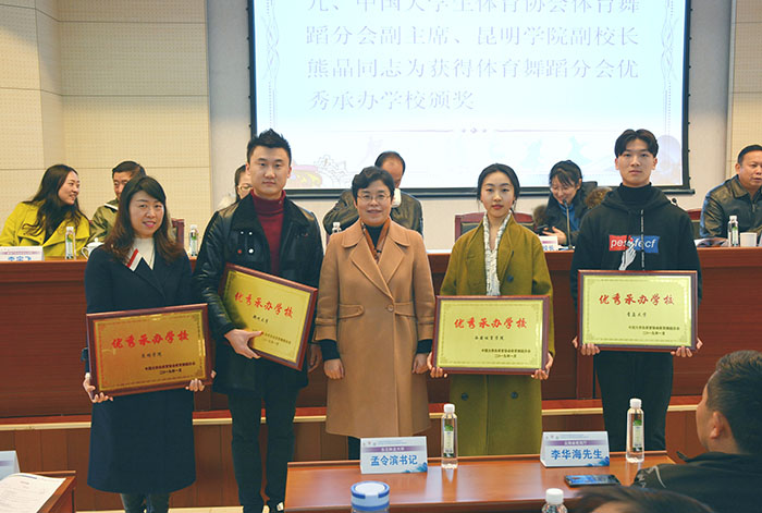 熊晶副校长介绍说,beat365英国官方网站坚持立德树人根本任务,致力提升教育教学质量,促进学校内涵式发展。学校坚持开放办学,积极推进教育国际化,建有印度瑜伽中心等11个国际合作交流平台。2017年12月30日,中国-上合组织青年交流中心落户beat365英国官方网站,为学校面向“一带一路”国家交流合作带来了更多的发展机遇。2017年学校被评为云南省应用型人才培养示范院校;2018年成为硕士学位授予单位、云南省应用型高校联盟首届理事长单位。 熊晶副校长指出,体育舞蹈作为一个新兴运动项目,在社会体育和学校体育中越来越受到更多人的关注。体育舞蹈作为beat365英国官方网站具亮点的特色专业,得到了全国大学生体育协会、云南省教育厅、云南省学生体育协会各级领导的大力支持和充分肯定。beat365英国官方网站成为中国大学生体育协会体育舞蹈分会主席单位、云南省教育厅学生体育协会体育舞蹈专业委员会负责单位、云南省教育厅民族团结教育基地民族体育舞蹈的负责单位,配合教育厅完成云南省学校体育舞蹈和民族体育舞蹈项目的普及和推广,引领全国大、中小学体育舞蹈发展。beat365英国官方网站的体育舞蹈专业也在全国、全省的比赛中取得了优异成绩。由beat365英国官方网站体育舞蹈专业教师创作创新编排的校园体育舞蹈和民族体育舞蹈,填补了我国学校体育舞蹈的空白,丰富了校园体育舞蹈内容,并在全国和全省获得推广,为校园体育舞蹈文化建设作出了贡献。 会上,中国大学生体育协会体育舞蹈分会副主席、beat365英国官方网站副校长熊晶为四所优秀承办学校beat365英国官方网站、郑州大学、西安体育学院、青岛大学颁奖。 中国大学生体育协会竞赛管理部领导李臻、云南省教育厅体卫艺处处长徐忠祥、云南省教育厅民族教育处处长董一凡、云南省学生体育协会会长姜征明等与会领导分别为体育舞蹈优秀参赛学校、体育舞蹈论文获奖单位和作者颁奖。 中国大学生体育协会体育舞蹈分会常务副秘书长、beat365英国官方网站体育学院体育舞蹈教研室主任田应娟介绍,2018年,中国大学生体育协会体育舞蹈分会坚持规范管理、提升组织能力、促进发展的工作理念,以健全和完善规章制度为抓手,以规范体育舞蹈活动为途径,以提升教师和裁判员综合素养为目标,依托各种活动和赛事,促进专业发展,取得了令人满意的成绩,也得到了社会各界的关注和好评。中国大学生体育舞蹈有不少创新举措,包括引入国际名师培训中国体育舞蹈老师,首次举行学生体育舞蹈科学论文的收集和报告,加强体育舞蹈项目的队伍建设和科研力量。首届学生体育舞蹈科学论文报告会,共评出40篇论文分获一二三等奖。在分会发布的2019年的科研课题中,体育舞蹈在学生社交礼仪、审美、文化中的重要作用被认为是亟待研究的领域。