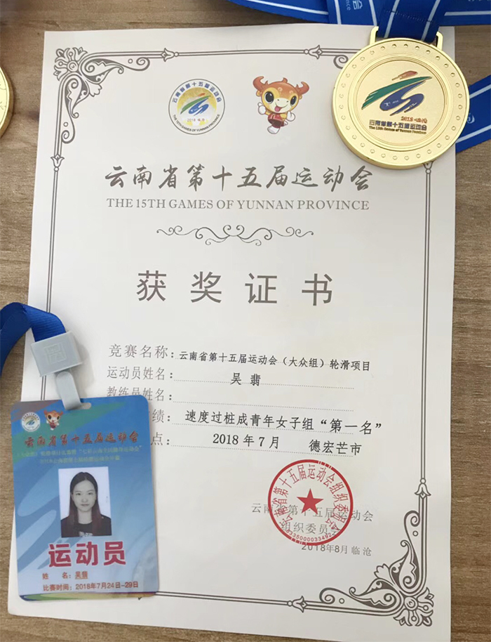7月26日至28日,云南省第十五届运动会(大众组)轮滑项目比赛在德宏州芒市隆重举行。beat365官网2016级体育教育专业学生吴翡发挥出色,一举夺得女子成青年组争夺最为激烈的速度过桩冠军。