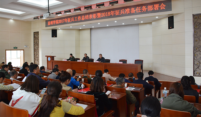 4月18日,beat365官网在行政楼D三报告厅召开2017年征兵工作表彰暨2018年征兵准备任务布置会。学校征兵工作领导小组组长、党委书记陈永明,官渡区人民武装部政委周文斌,党委宣传部、纪委办、教务处、学生处、武装部、招就处、校团委、保卫处负责人,各院系党总支书记及分管学生工作副书记,全体辅导员参加了会议。会议由学校党委副书记张祖武主持。 会议表彰2017年征兵工作先进集体和个人。美艺学院和旅游学院分别代表先进集体、优秀个人作交流发言。周文斌政委指出,大学生应征入伍是我国国防的需要,也是建一流军队的重要组成部分,提高官兵综合素质是加强国防事业力量的重要保障。兵源素质是提升部队素质和战斗力的基础,士兵素质的改善和提升才能更好的发挥现代化军事武装的效率,实现中国强军梦。 陈永明书记强调,征兵工作是事关国家安全稳定和军队现代化建设全局的重要工作,对打牢国防和军队现代化建设基础、促进国防建设和经济建设融合发展有着积极意义。军队人员素质的提升,是建设信息化部队,全面建成世界一流军队的有效保障。