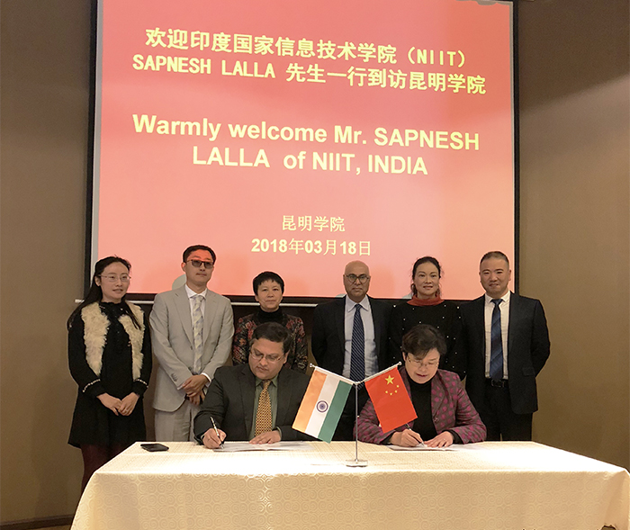 3月18日, 印度国家信息学院(NIIT)全球CEO赛普勒斯•拉乐先生Mr. Sapnesh Lalla、中国区总裁卡摩尔•杜普尔先生Mr. Kamal Dhuper、中国政府事务和商务拓展总监徐海峰先生、西南区域负责人袁野先生一行来访beat365官网。beat365官网校长黎素梅、副校长熊晶及相关部门负责人陪同来访客人参观教学、科研实验室。beat365官网一流的教学、科研实验室给来访客人留下了深刻的印象。