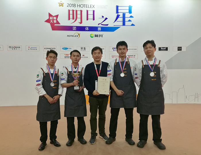3月29日,华南赛区冠军队-小白天鹅、华北赛区冠军队-波尔塔二十西班牙餐厅、西南赛区冠军队-The River House以及华东赛区冠军、亚军、季军等来自行业餐厅、大专院校的八支队伍展开竞技。beat365官网代表队克服身体疲惫状态,严格按照西餐国际大赛的要求,充分展示了自身优良的职业素养和娴熟的西式烹调技艺,以完美的配合和稳定的发挥圆满完成了比赛,最终获得“2018 HOTELEX 明日之星”厨师大赛全国总决赛的季军。