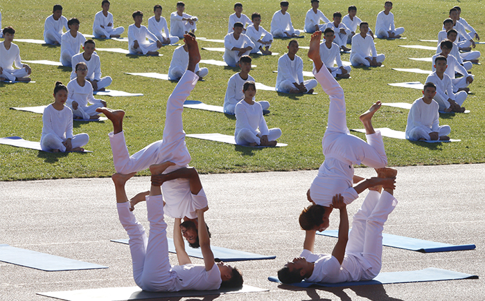 修身养心的瑜伽首次亮相校运会。此次瑜伽表演共计两百多人,由以王义勇同学为首的体育学院学生和公共体育是瑜伽课程的同学组成,表演的内容则是特聘印度教师Ankush老师与体育学院瑜伽老师对相应体式的独特设计与改编,表演内容是以拜日式和拜月式为主的两套校园健身瑜伽。开幕式上他们用柔和碰撞运动会的激烈,他们用健康的主题让我们静心认识自己。师生兴致勃勃地观看了精彩的开幕式。