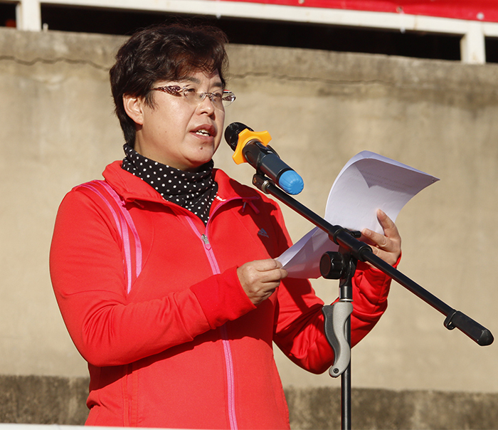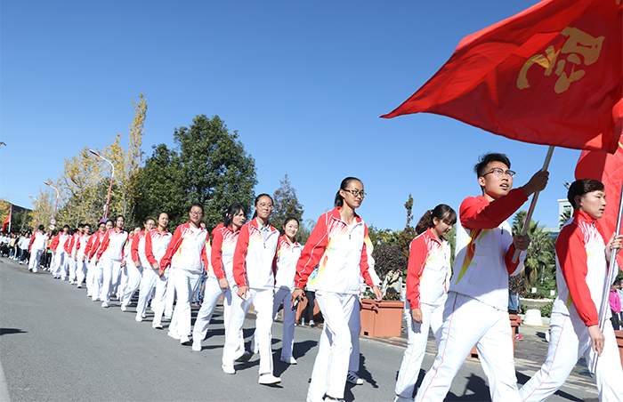 熊晶副校长致开幕辞。强健的体魄、积极的心态是我们学习和事业的有利保障,希望老师们、同学们积极参与到三天运动会的各个项目中来。在今后的学习、工作和生活中积极参与体育锻炼,把健康留给自己,把快乐传遍整个校园。希望全体运动员和裁判员在赛场上尊重比赛,尊重裁判,尊重对手,公正裁决,公平比赛。最后,熊副校长预祝参赛选手们取得好成绩,预祝运动会圆满成功,祝全校师生身体健康。