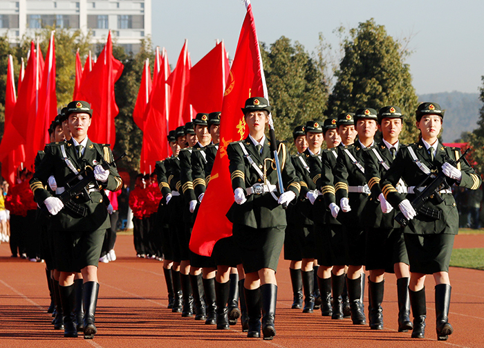 天空湛蓝,阳光明媚。国旗护卫队、红旗队、鲜花队、教职工代表队及18家学院方队踏着整齐的步伐步入田径场。入场后,全体起立,由大学生艺术团奏响国歌,举行升旗仪式。