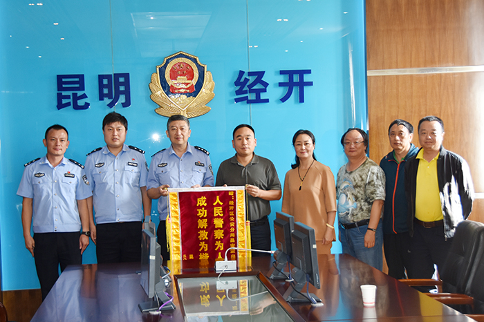郭华副校长代表学校对经开公安分局多年来为维护学校的安全稳定和保护广大师生的人身财产安全付出的辛劳表示衷心的感谢。对今年8月经开公安分局派出二名警官远赴湖北省襄阳市,帮助学校成功解救陷入非法传销组织的在校女大学生李某某,表示了诚挚的谢意。随后,郭副校长向经开公安分局赠送了内容为“人民警察为人民,成功解救为楷模”的锦旗。