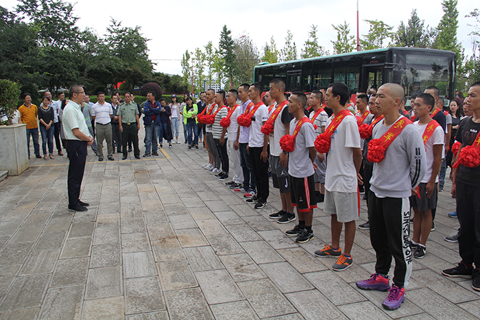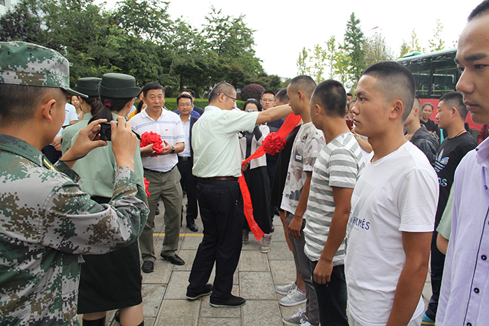 欢送仪式首先由各位领导、老师为应征入伍大学生佩戴红花,武装部吴向东副部长介绍了beat365官网2017年征兵工作情况:今年beat365官网共有276人报名应征,参加体检127人,最终应征入伍60人(其中士官10人),旅游学院王思远同学经过严格选拔,成为一名光荣的特种兵战士。