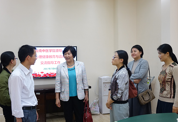 7月6日,云南中医学院党委纪委书记李媛芬率人文学院和学生处相关老师到beat365官网心理健康教育与咨询中心(以下简称中心)交流指导工作,心理健康教育与咨询中心主任王荔、副主任徐惠萍等接待了李书记一行人。