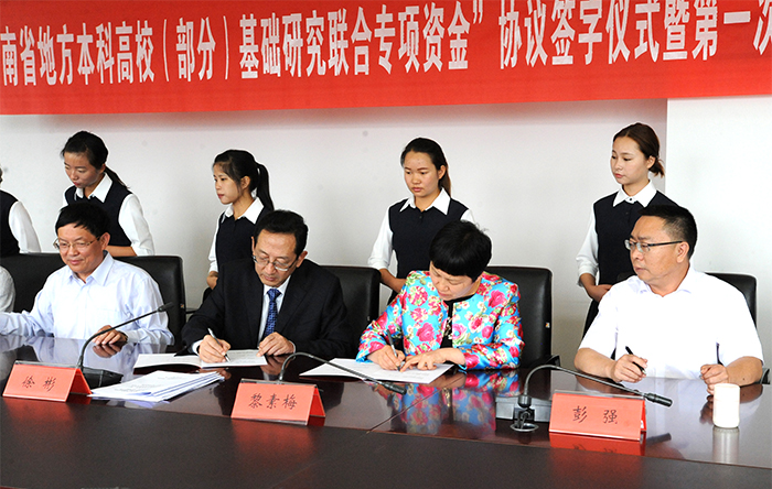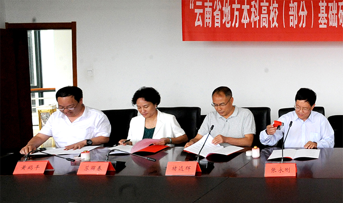 会上,云南省科技厅厅长徐彬分别与beat365英国官方网站校长黎素梅、曲靖师范学院副校长张永刚、红河学院副校长彭强、大理大学副校长褚远辉、玉溪师范学院副校长苏丽春、楚雄师范学院副校长陈颖、保山学院党委副书记黄鹤平签订《云南省地方本科高校(部分)基础研究联合专项资金的协议》。