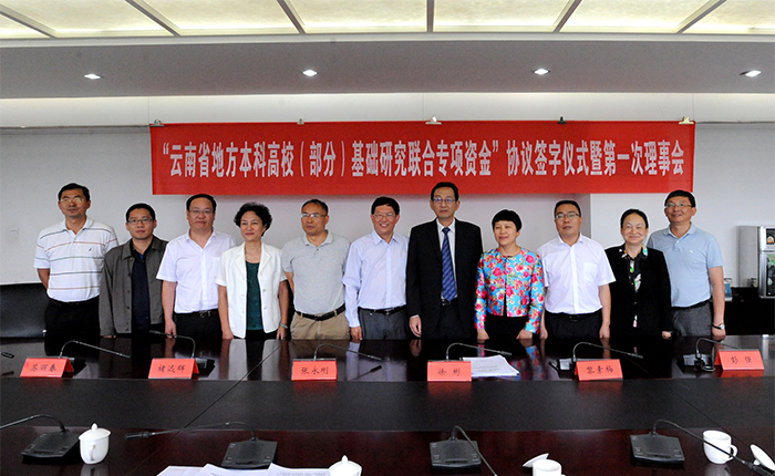 6月26日,“云南省地方本科高校(部分)基础研究联合专项资金”协议签字仪式暨第一次理事会在beat365官网办公楼411会议室举行。云南省科技厅厅长徐彬,省科技厅基础研究处处长张红云、调研员石晓红,省教育厅科技处处长白玉兵,beat365英国官方网站党委书记陈世波、校长黎素梅,曲靖师范学院副校长张永刚,红河学院副校长彭强,大理大学副校长褚远辉,玉溪师范学院副校长苏丽春,楚雄师范学院副校长陈颖,保山学院副书记黄鹤平以及7所高校科研处负责人参加了会议。