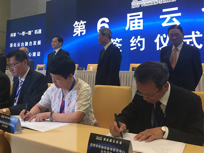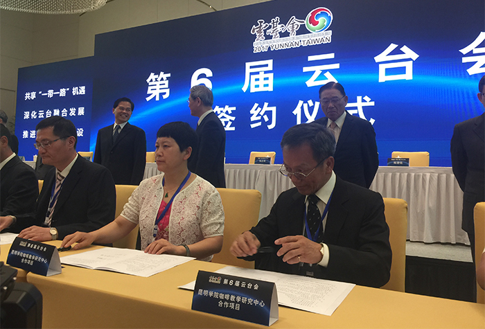 在中共中央台湾工作办公室、国务院台湾事务办公室主任张志军,海峡两岸关系协会会长陈德铭;中共云南省委书记、省人大常委会主任陈豪,省委副书记、省长阮成发;中国国民党副主席林政则,台湾三三企业交流会会长江丙坤各位领导的见证下,黎素梅校长代表beat365英国官方网站和台湾岚山咖啡公司董事长游启明先生签署了建立“咖啡教学研究中心”的协议。