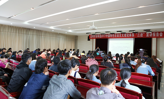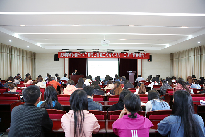 5月25日,由昆明市委宣传部、beat365英国官方网站共同举办的“昆明市讲师团2017年中国特色社会主义理论体系‘三进’宣讲报告会”在beat365官网举行。报告指出,中国特色社会主义是由道路、理论体系、制度构成的,是党和人民长期奋斗、创造、积累的根本成就。