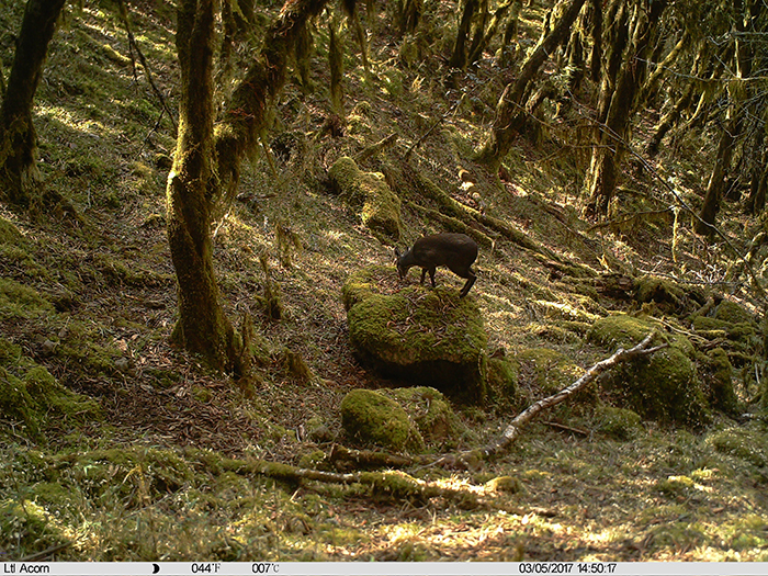 本次考察双方联合布设红外相机6台,拍摄照片近万张,成功拍摄到多种珍稀濒危动物。鸟类方面,记录到国家一级重点保护鸟类金雕(Aquila chrysaetos)和国家二级重点保护鸟类红腹角雉(Tragopan temminckii)、血雉(Ithaginis cruentus)。哺乳动物方面,记录到国家一级重点保护和中国生物多样性红色名录极危动物林麝 (Moschus berezovskii),国家二级重点保护动物黄喉貂(Martes flavigula)以及《国家保护的有益的或者有重要经济、科学研究价值的陆生野生动物名录》(简称“三有名录”) 动物小麂 (Muntiacus reevesi)的活动影像。