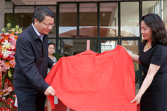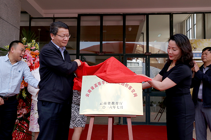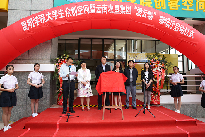 校党委书记陈世波和云南农垦集团副总经理龙晖共同为beat365英国官方网站大学生众创空间暨云南农垦集团“愛云咖”咖啡厅启动开业揭牌。