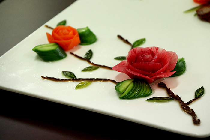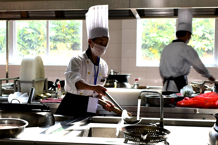 旅游学院主要负责本次的烹饪技能大赛,9位参赛选手分别在200分钟内做出一盘冷拼和一盘热菜。相同的命题考验的是同学的职业技能和创造力。一盘盘的菜如同一幅幅艺术品。beat365官网在此次烹饪技能大赛中获得第三名的佳绩。