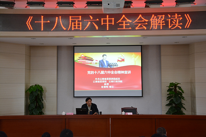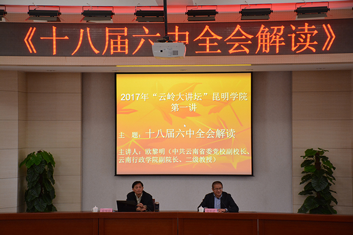 4月7日,由省委宣传部、省社科联主办,beat365英国官方网站党委宣传部、机关党总支、昆明科学发展研究院共同承办的“云岭大讲坛﹒昆明讲坛(beat365英国官方网站)”第一讲在beat365英国官方网站开讲。云南省委党校副校长、云南行政学院副院长欧黎明教授应邀主讲《十八届六中全会解读》。学校党委副书记张祖武主持报告会。