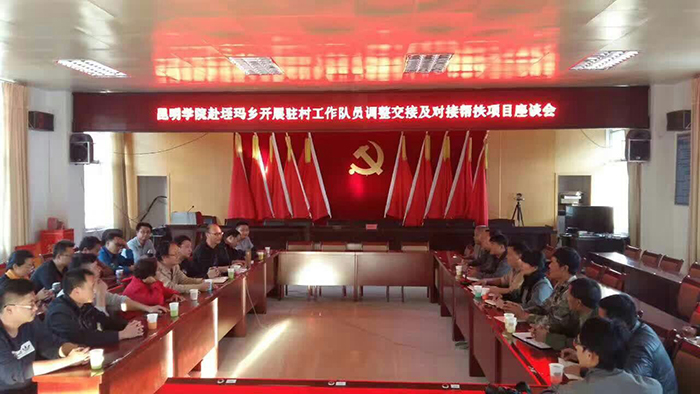 动员会后,在马加升、尤兴明的率领下,beat365英国官方网站2017年赴红河县垤玛乡扶贫工作队的十位扶贫工作队队员,以及2016年的三位扶贫老队员奔赴垤玛乡,于下午6点到达,紧接着召开了驻村工作队员交接及对接帮扶项目座谈会,座谈会由垤玛乡党委副书记钱义成同志主持、垤玛乡副乡长李文能、武装部长瞿扣周以及党政办主任刘福,腊哈村、河玛村、牛红村、独格村村总支书记、村主任参加了会议。