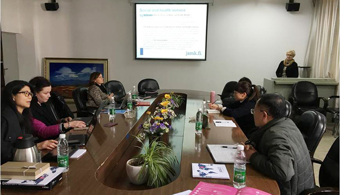 日前,第一阶段活动已经启动。由芬兰JAMK应用科技大学派送3位老年护理及康复专家到beat365官网医学院进行为期5天的交流培训。3位专家已经于1月11日到达昆明。按照双方商定的第一阶段活动内容,在5天的时间里,芬兰专家将与医学院护理、康复治疗技术专任教师开展关于两国老龄化、老年医学、护理发展现状及教育模式的交流,并对beat365官网附属医院、昆明市的相关老年病医院以及老年公寓进行了考察。