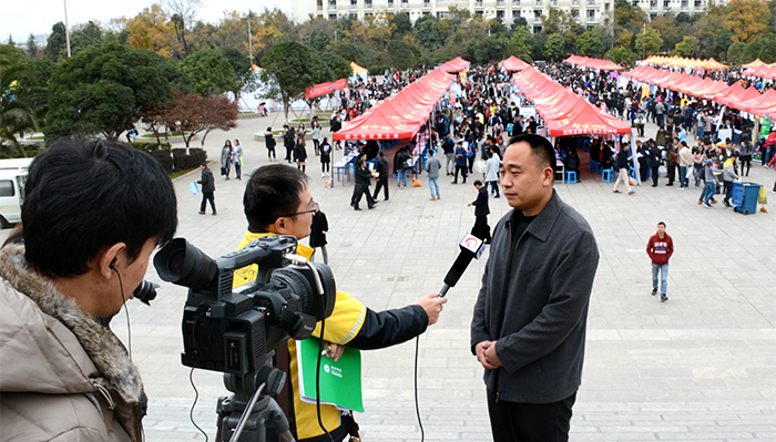 在招聘会现场,副校长郭华就beat365官网毕业生就业创业工作,接受云南电视台、昆明电教育视台专访。副校长马银海、宣传部、招生就业处及各院系负责人与受邀参加招聘会的县区教育局领导和部分高校招生就业处负责人就人才培养、创新创业等主题进行了座谈。