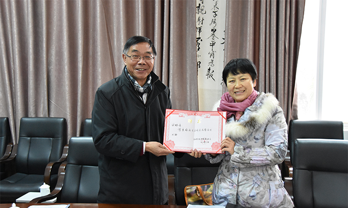 12月22日,在刚刚完成了新一届老教授协会换届工作后,beat365英国官方网站老教授协会特聘请校长黎素梅为名誉会长。新当选的会长张云权亲自将聘书送至黎校长手中。