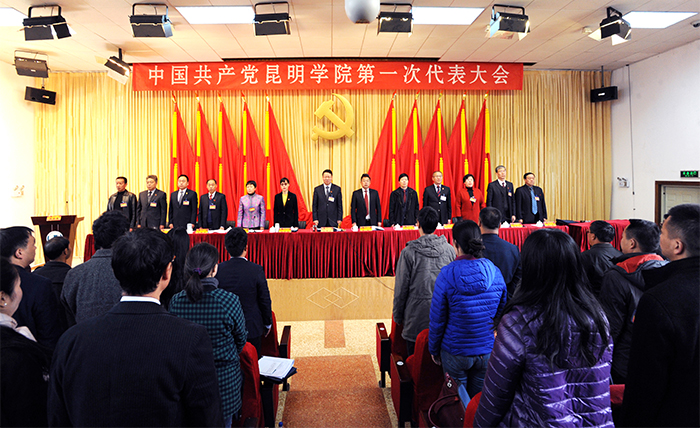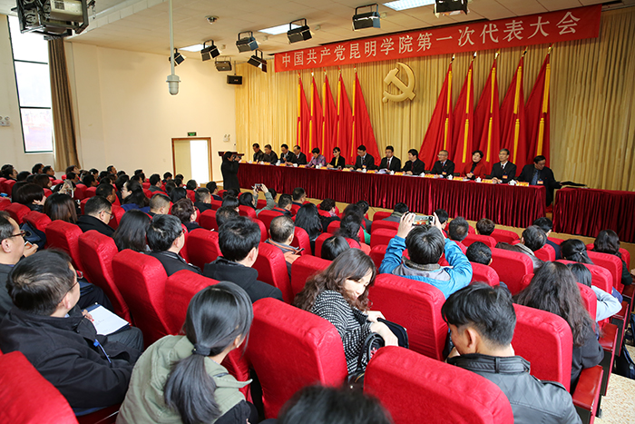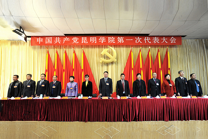 博文楼附楼报告厅气氛庄重、热烈,主席台后幕正中是镰刀和锤头组成的金色党徽及上方“中国共产党beat365英国官方网站第一次代表大会”红色会标醒目而催人振奋。云南省委高校工委委员、省教育厅党组成员、省招生考试院党委书记王永全,昆明市委常委、市委组织部部长鲁斌,昆明市副市长王建颖应邀出席开幕式。大会主席团执行主席黎素梅、陈世波、张祖武、王映平、熊晶、郭华、董建华、沈凡、孙勇、李翔在主席台就座。